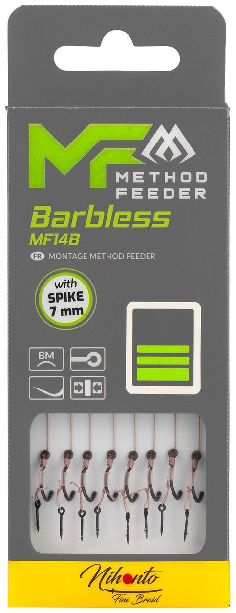 Hotové náväzce určené pre method feeder na háčikoch MF14 bez protihrotu. Náväzce sú extrémne ostré a pevné. Každý náväzec má koniec riešený Push Stop, alternatívne s gumičkou alebo tŕňom na fixáciu nástrahy.