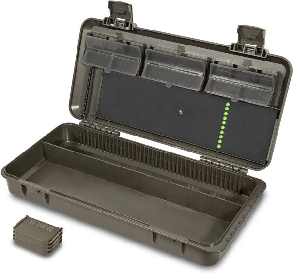 KlikBox Long je navyše vybavený platom z tvrdenej peny a špendlíky na pohodlné uchytenie koncových montáží. Pozdĺž celého odkladacieho priestoru na náväzke nájdete merítko, podľa ktorého si budete vedieť presne určiť dĺžku vašich koncových montáží. Organizér je vyrobený z veľmi odolného plastu a na jeho komfortné otváranie a uzatváranie poslúži dva pevné plastové klipy.