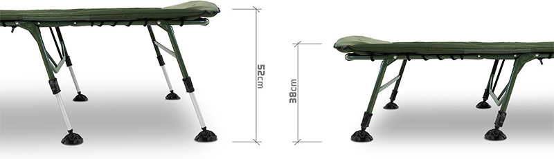 Lehátko je postavené na pevnej kovovej konštrukcii s vysokou nosnosťou, ktorá napriek svojej odolnosti zostáva ľahká a ľahko prenosná. Na konštrukcii sa nachádza osem výškovo nastaviteľných nôh, ktoré je možné vysunúť až do výšky 52 cm. Každá noha je vybavená širokou flexibilnou pätkou, ktorá účinne zabraňuje zapadaniu do mäkkej pôdy a zaisťuje stabilitu aj na nerovnom povrchu. Pár nôh pod hlavou je navyše vybavený zaisťovacím mechanizmom, čo uľahčuje rozloženie lehátka a zároveň zabraňuje nechcenému sklápaniu či posunu.
