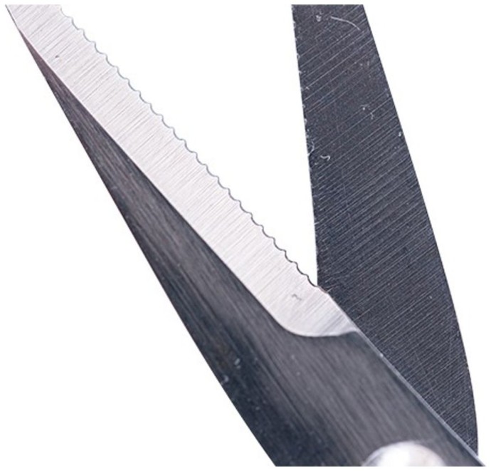- Vrúbkované ostrie: Jemné vrúbkovanie na jednom z ostrie bráni preklzovaniu vlasca a umožňuje presný strih.