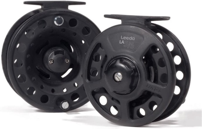 Muškársky navijak Leeda LA vo veľkosti 5/6, ktorý má telo vyrobené z grafitového kompozitu. Navijak je osadený brzdou.