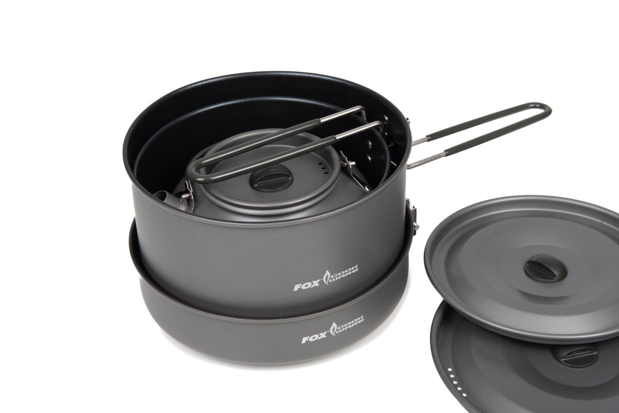 Veľká 4dielna sada riadu Fox Cookware Deluxe Cook Set je navrhnutá na kempovanie a varenie pri vode. Sada obsahuje kanvicu Heat Transfer 0,9 l, stredný hrniec (súčasť 3dielnej sady), veľký hrniec a panvicu – ideálny pre rybárov, ktorí si radi pripravujú výdatné pokrmy priamo pri brehu.