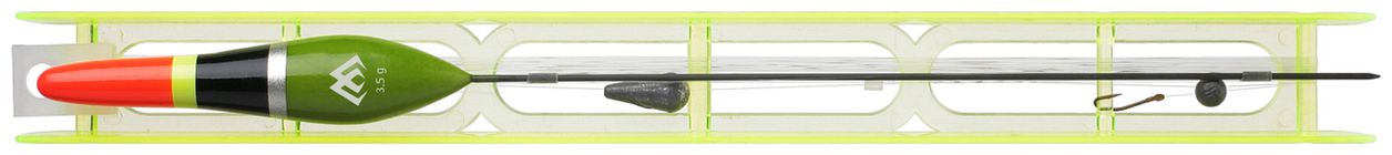 Kompletná zostava hotového náväzca: plavák s hmotnosťou podľa variantu, háčik č. 10, vlasec s priemerom 0,16/0,14 mm a záťaže, všetko navinuté na navijatku, nazbrojené a pripravené na použitie.