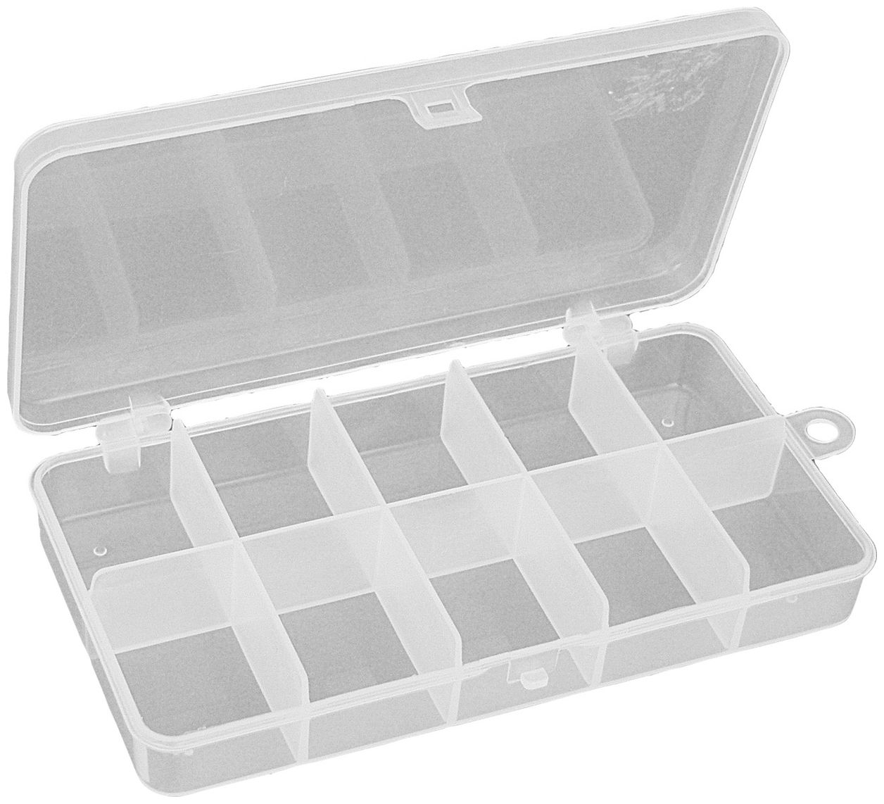 Stredne veľká krabička z odolného priehľadného plastu, navrhnutá na prehľadné uloženie sady príslušenstva pre konkrétny spôsob rybolovu. Krabička obsahuje pohyblivé priehradky, ktoré umožňujú preskupiť vnútorný priestor podľa potreby a nastaviť samostatné priehradky pre jednotlivé woblery, trblietky či iné nástrahy.
