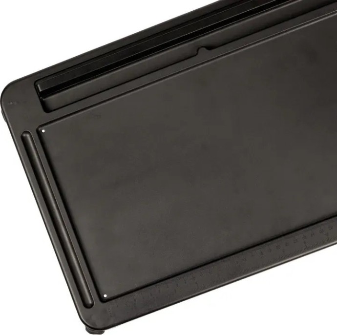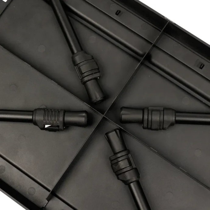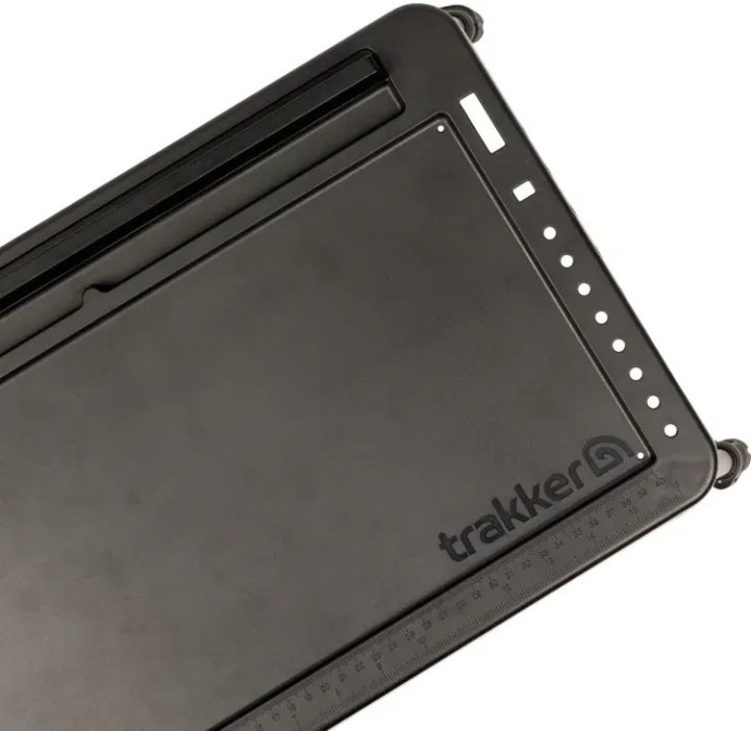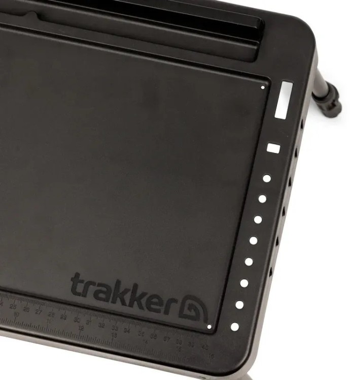 Stolík ponúka výrez pre telefón alebo tablet, bočné úložné priestory aj otvory pre nástroje na náväzce, pričom krátke strany slúžia na uloženie hotových náväzcov a všetko máte vždy po ruke.