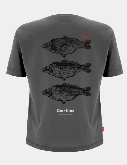Naše tričko 3 Kings bolo ručne vyrobené technikou známou ako „pointilizmus“, ktorá využíva milióny drobných bodiek na vytvorenie svetlých a tmavých plôch. Oslavujeme 3 druhy kaprov kráľovských, ktoré všetci lovíme. Trojfarebná sieťotlač na super mäkkej 150g organickej látke „bridlicovo šedej“ s tkaným bočným štítkom,